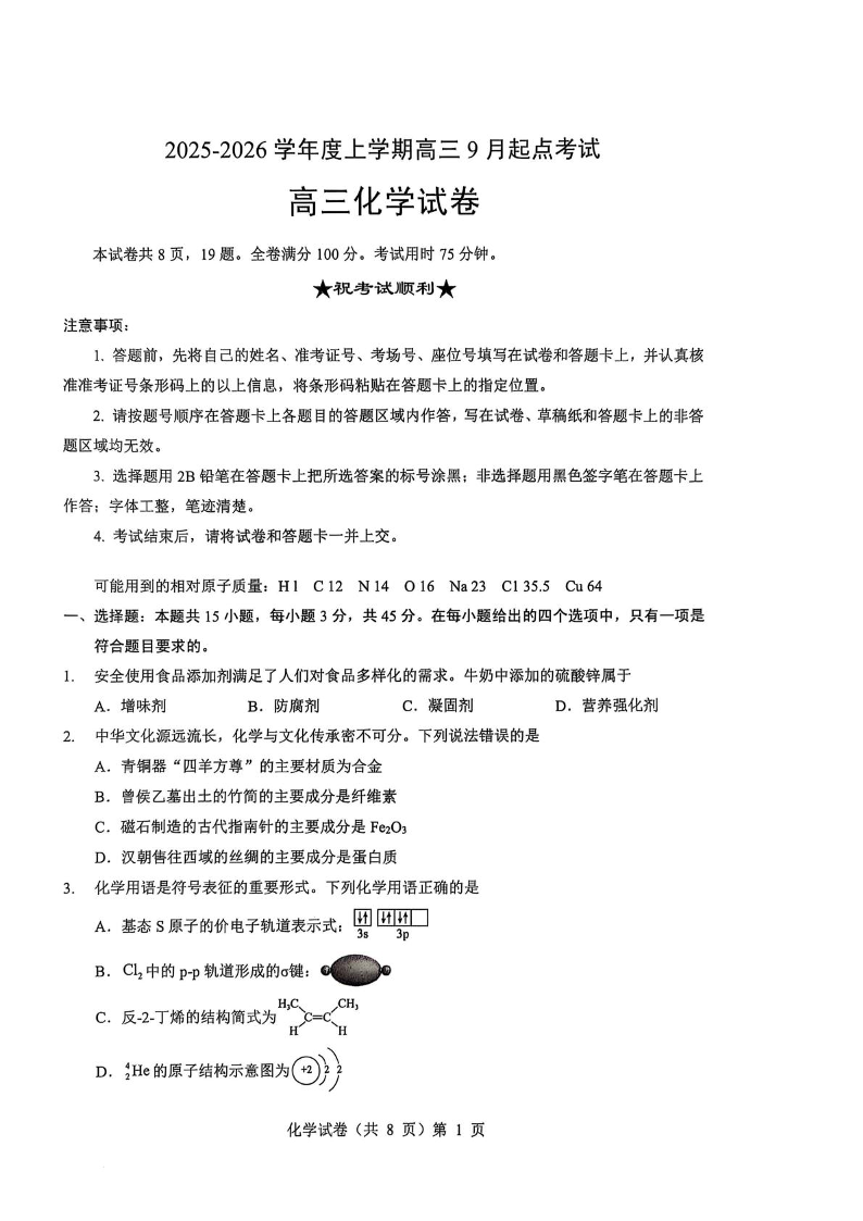 湖北省楚天协作体2026届高三上学期9月起点考试 化学.pdf