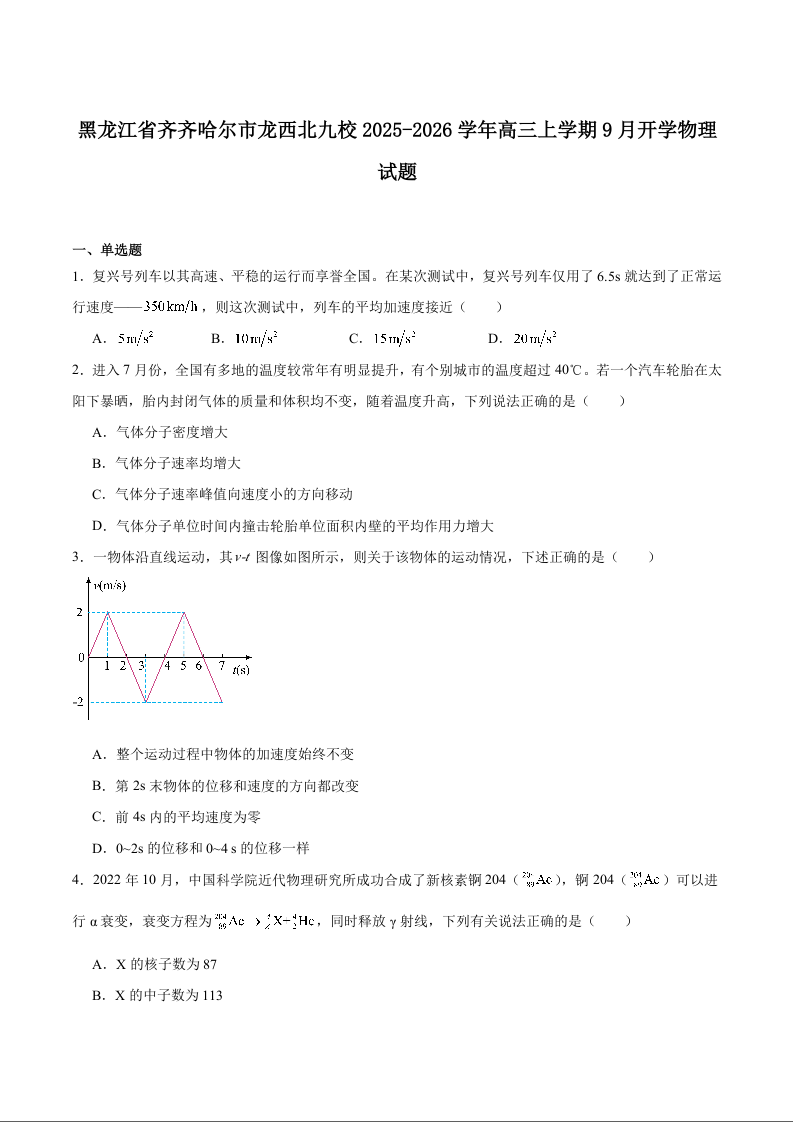 龙西北高中名校联盟2025-2026学年度高三上学期开学考 物理试卷(含答案).docx
