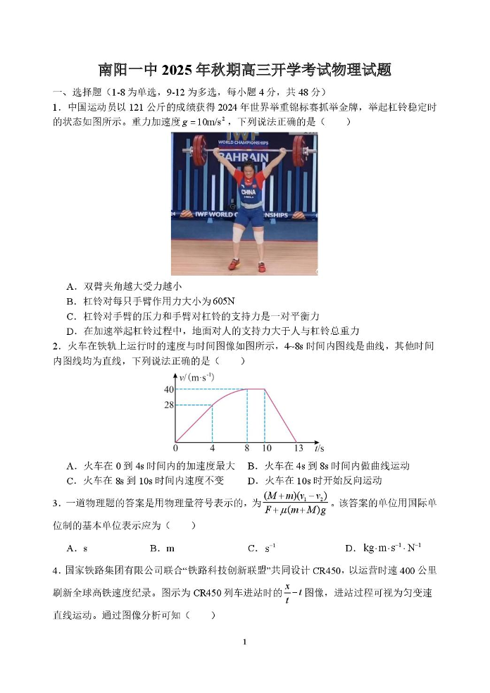 河南省南阳一中2025年秋期高三年级开学考试 物理试卷(含答案).pdf
