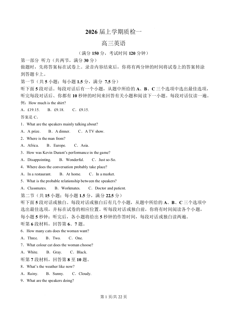 河北省衡水市高中联考2026届高三上学期质检(一)英语答案.docx