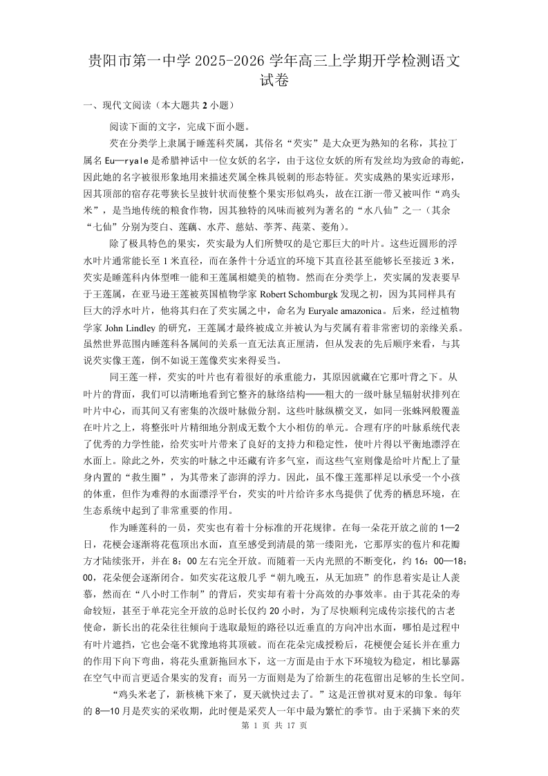 贵州省贵阳市第一中学2026届高三上学期9月开学考试 语文试卷(含答案).docx
