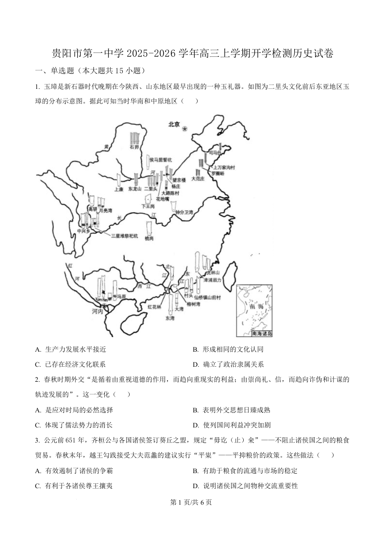 贵州省贵阳市第一中学2026届高三上学期9月开学考试 历史.docx