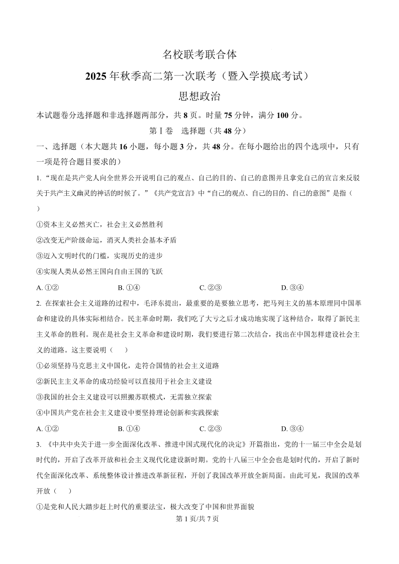 湖南省长沙市名校联考联合体2025-2026学年高二上学期第一次联考 政治.pdf