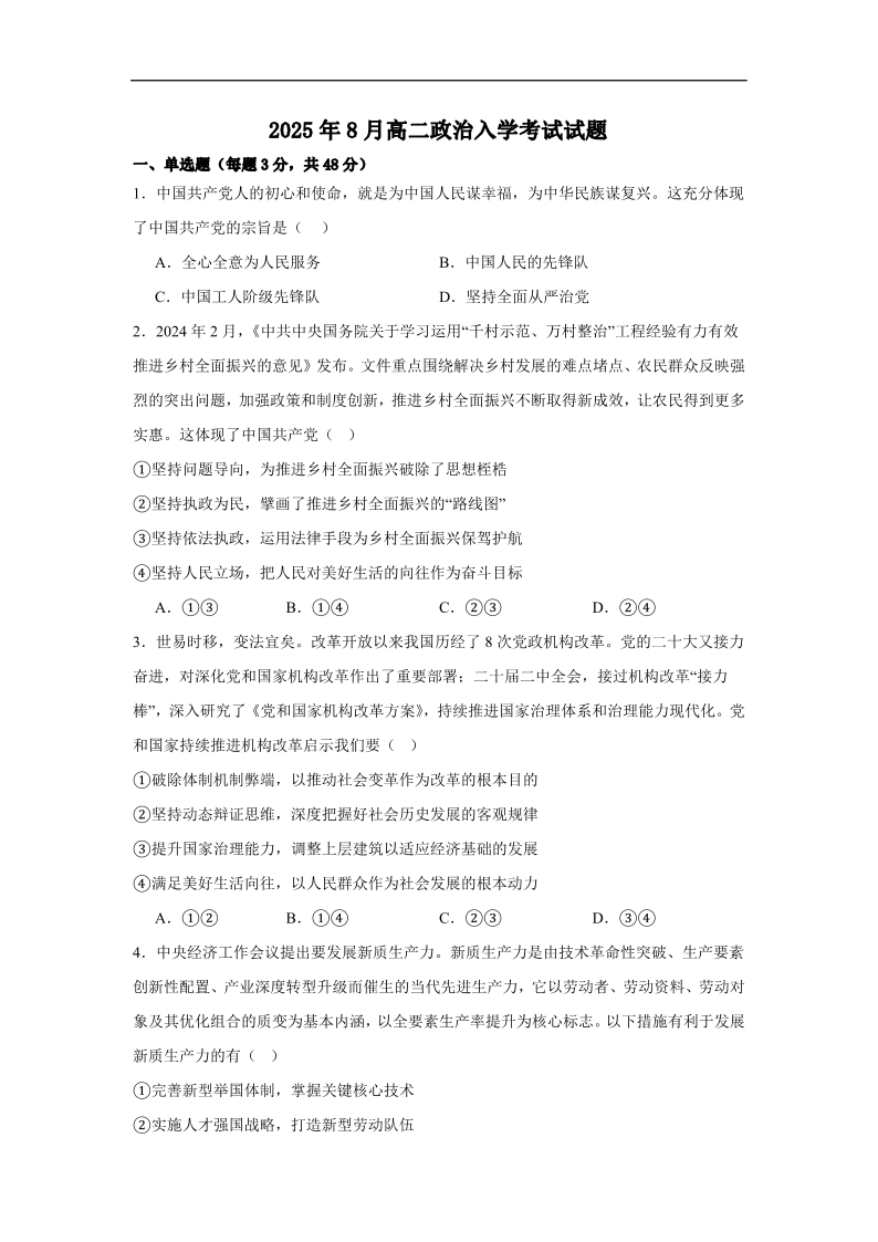 湖南省岳阳市汨罗市第二中学2025-2026学年高二入学考试 政治试题(含答案).pdf