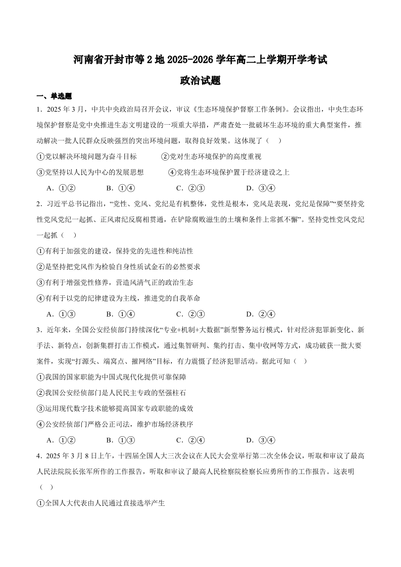 河南省开封市等2地2025-2026学年高二上学期开学考试 政治试卷(含答案).pdf