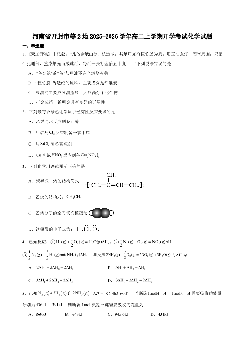 河南省开封市等2地2025-2026学年高二上学期开学考试 化学试卷(含答案).pdf