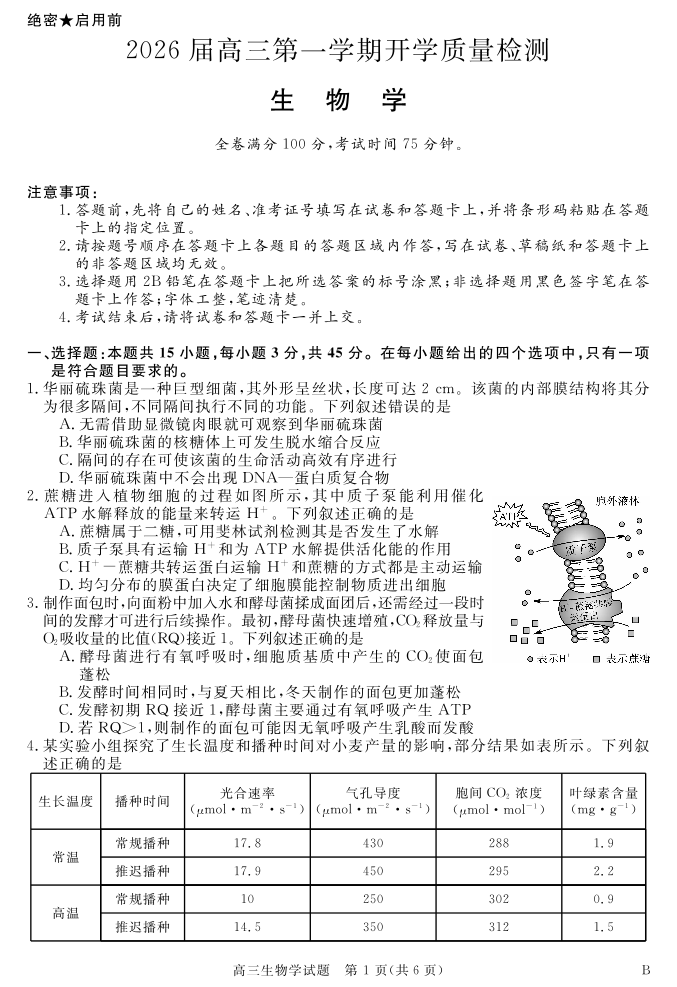 安徽省华师联盟2026届高三9月开学联考 生物.pdf
