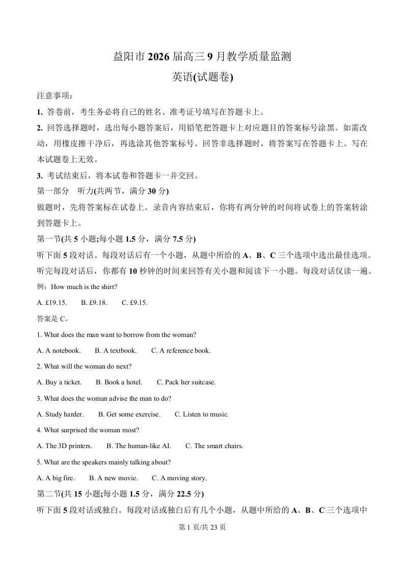 湖南省益阳市2026届高三上学期9月教学质量监测 英语答案.docx