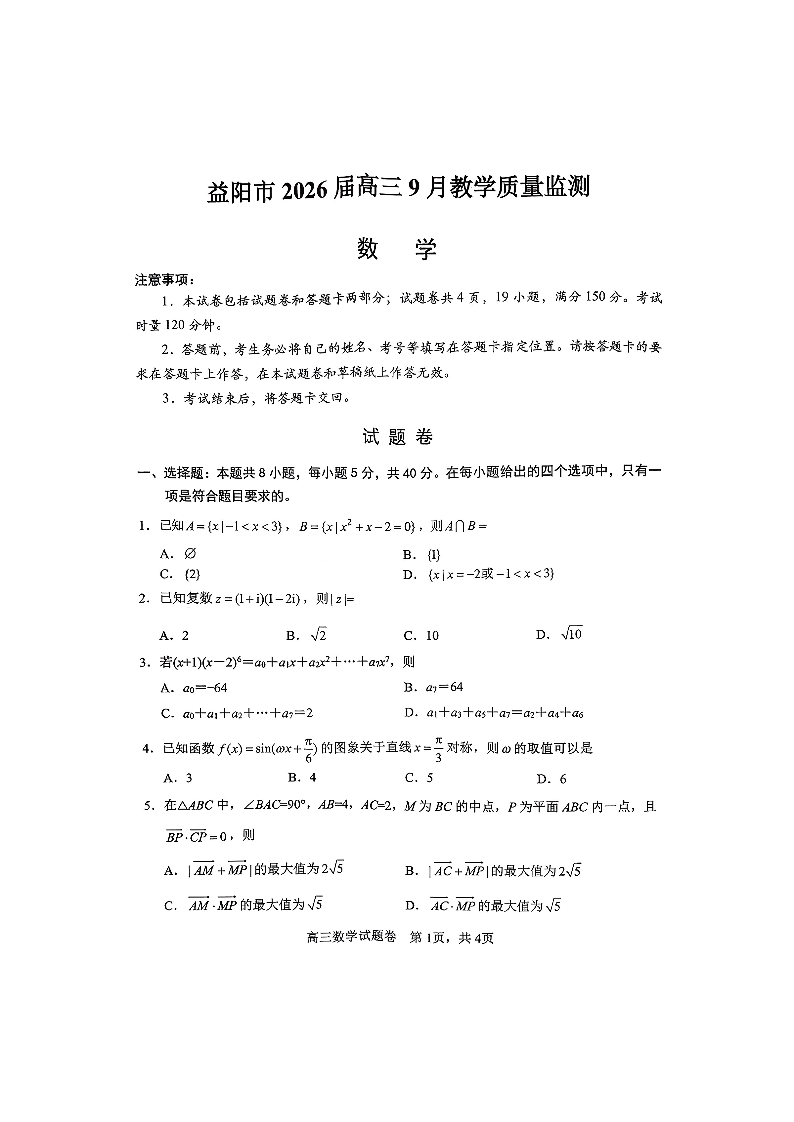 湖南省益阳市2026届高三上学期9月教学质量监测 数学试卷(含答案).pdf