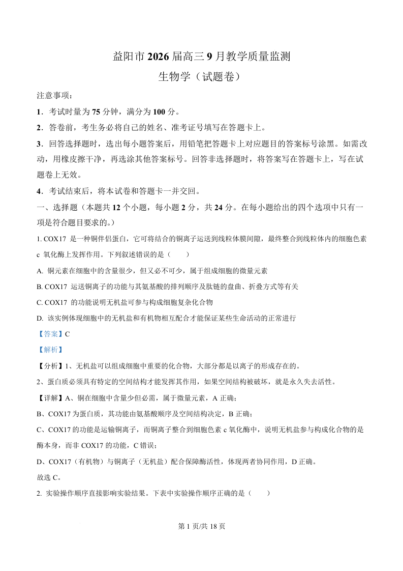 湖南省益阳市2026届高三上学期9月教学质量监测 生物答案.docx