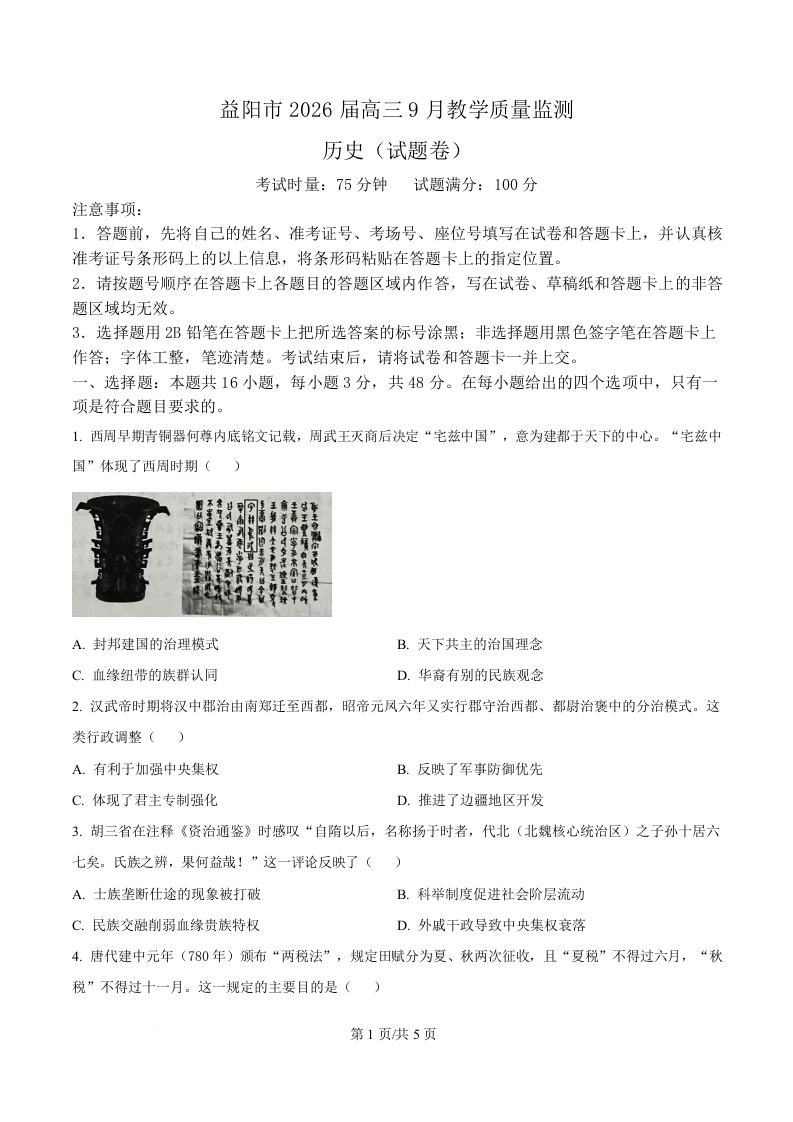 湖南省益阳市2026届高三上学期9月教学质量监测 历史.docx