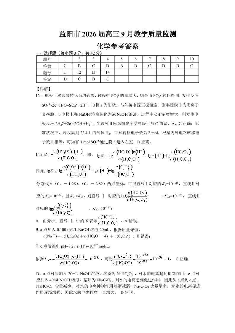 湖南省益阳市2026届高三上学期9月教学质量监测 化学答案.docx