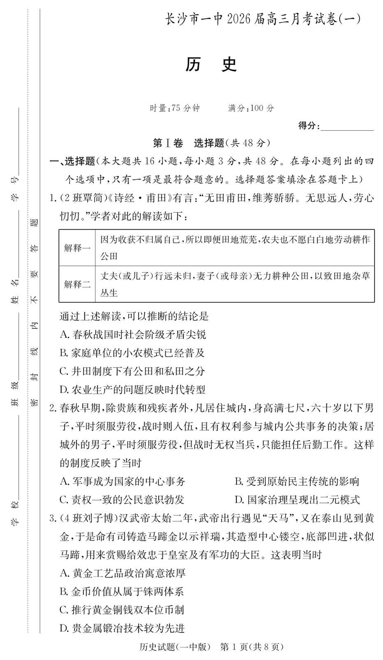 湖南省炎德·英才大联考长沙市一中2026届高三月考试卷(一)历史.pdf