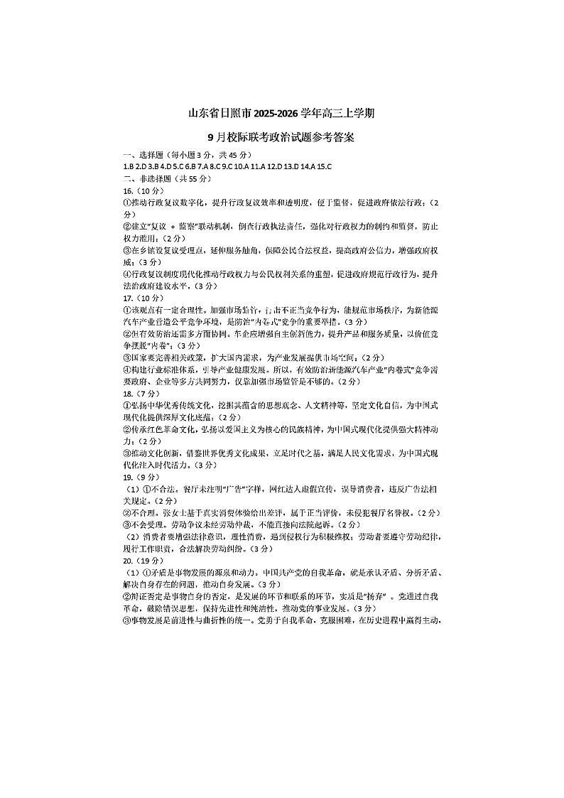 山东省日照市2026届高三年级上学期校际联合考试 政治答案.pdf