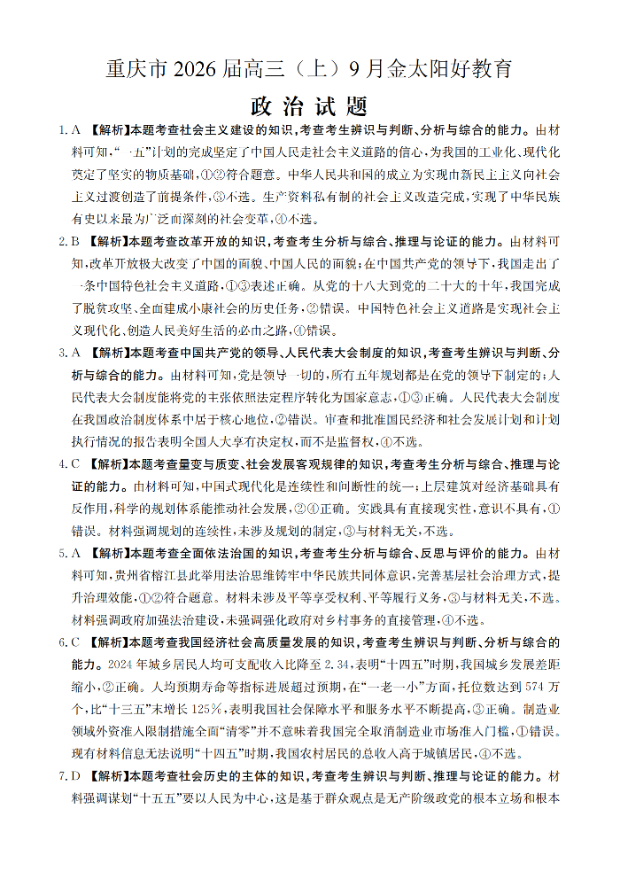 重庆市金太阳好教育联盟2026届高三9月开学联考 政治答案.pdf