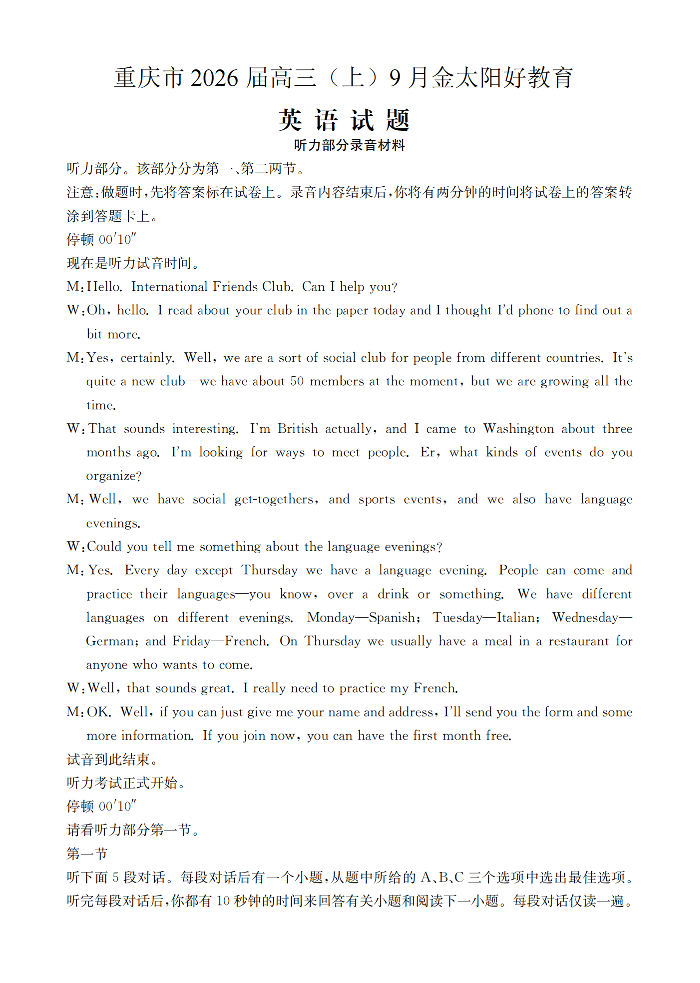 重庆市金太阳好教育联盟2026届高三9月开学联考 英语答案.pdf