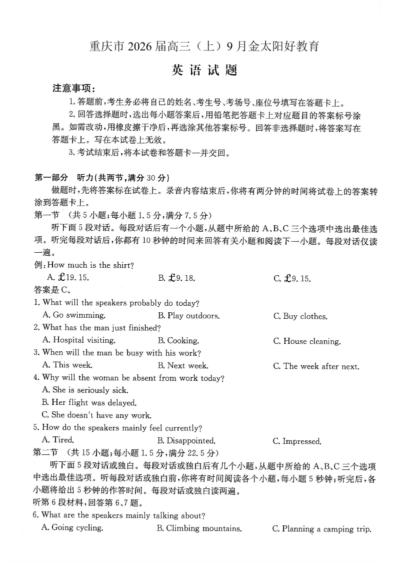 重庆市金太阳好教育联盟2026届高三9月开学联考 英语.pdf