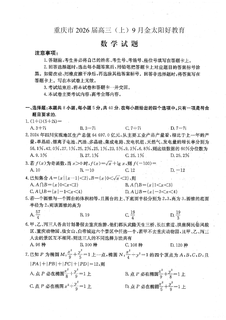 重庆市金太阳好教育联盟2026届高三9月开学联考 数学.pdf