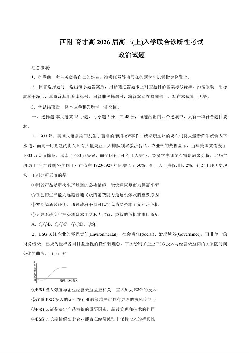 2025-2026西附、育才高三上开学考 政治试卷(含答案).docx