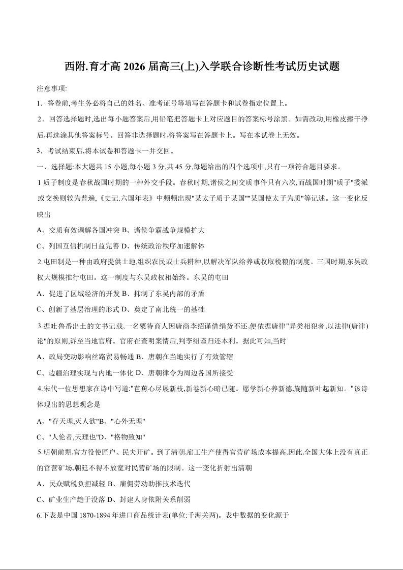 2025-2026西附、育才高三上开学考 历史试卷(含答案).docx