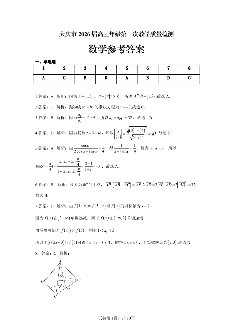 大庆市2026届高三年级第一次教学质量检测 数学答案.pdf