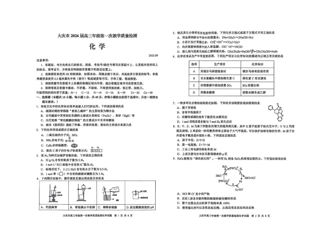 大庆市2026届高三年级第一次教学质量检测 化学.pdf