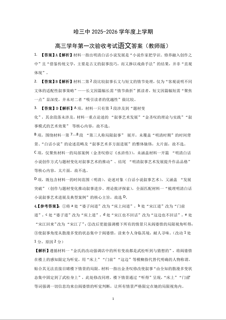 哈三中2025-2026学年度上学期高三学年第一次验收考试 语文答案.docx