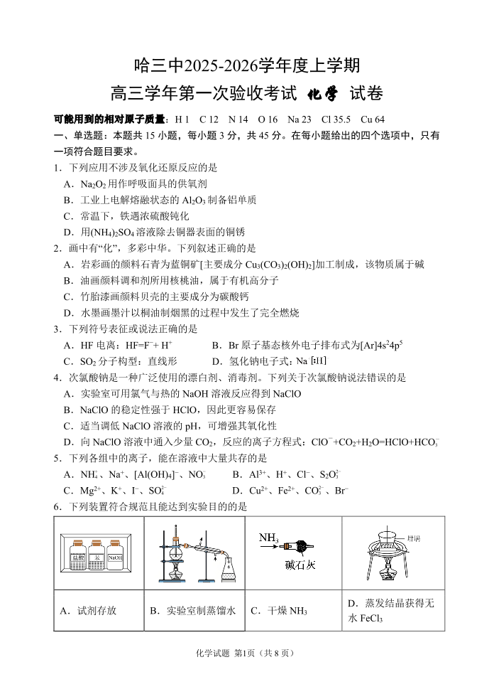 哈三中2025-2026学年度上学期高三学年第一次验收考试 化学.pdf
