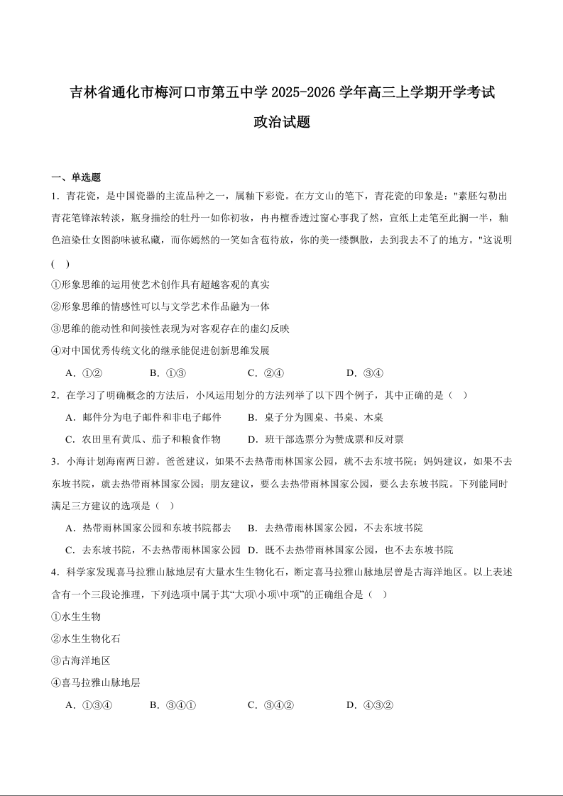 吉林省梅河口市第五中学2026届高三上学期开学考试 政治试卷(含答案).docx