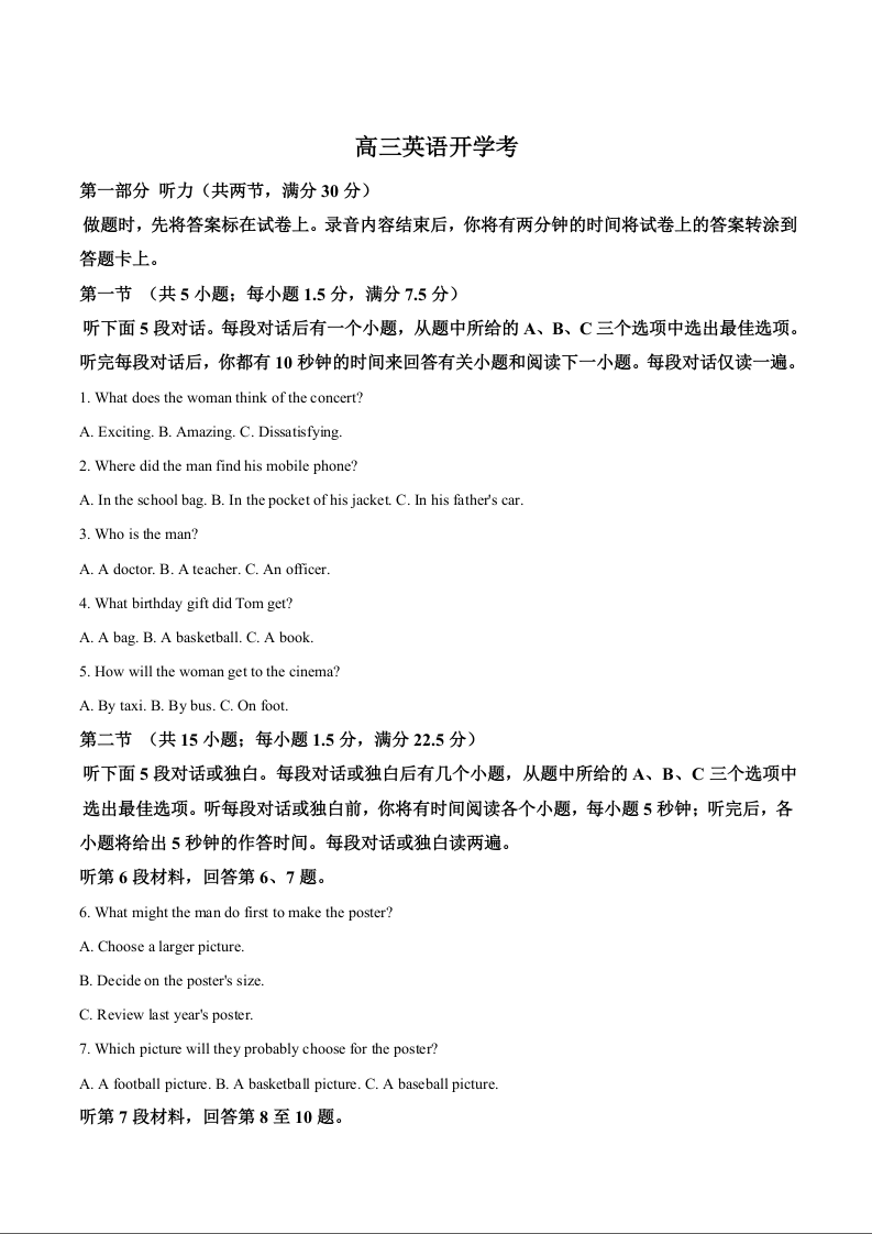 吉林省梅河口市第五中学2026届高三上学期开学考试 英语试卷(含答案).docx
