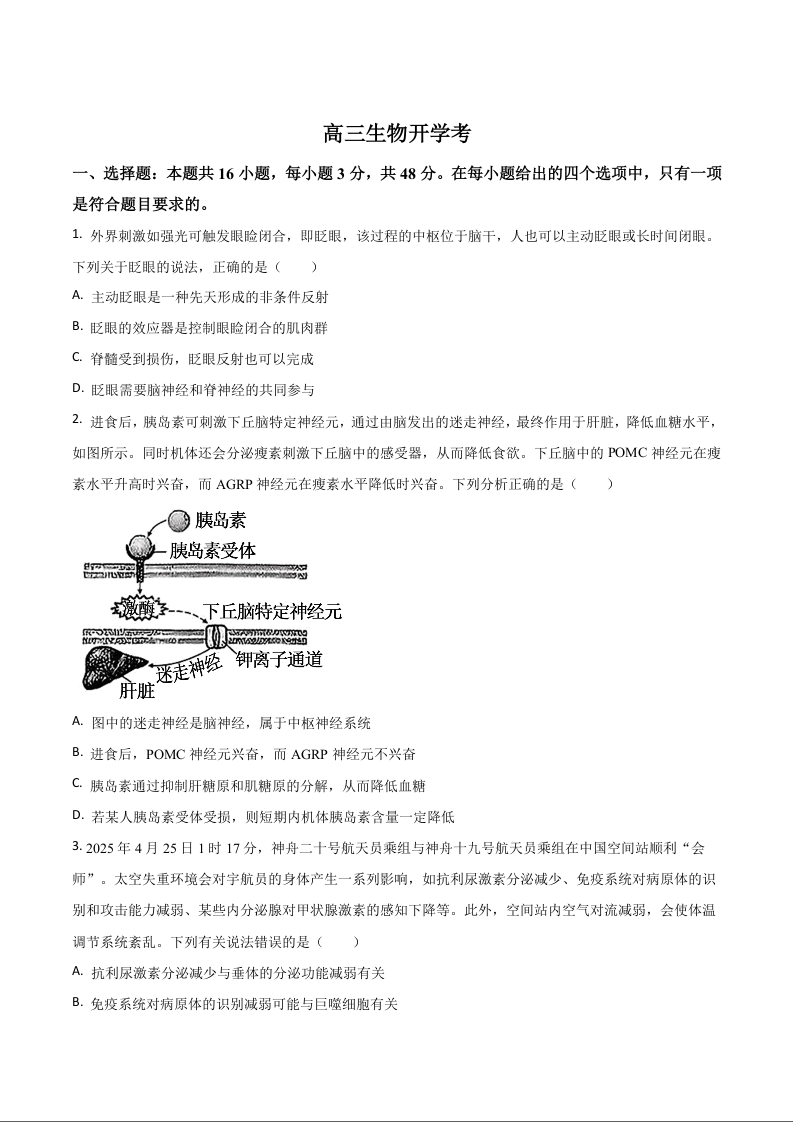 吉林省梅河口市第五中学2026届高三上学期开学考试 生物试卷(含答案).docx