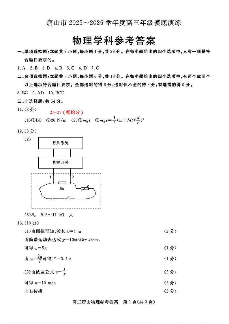 唐山市2025-2026学年度高三年级摸底演练 物理答案.pdf