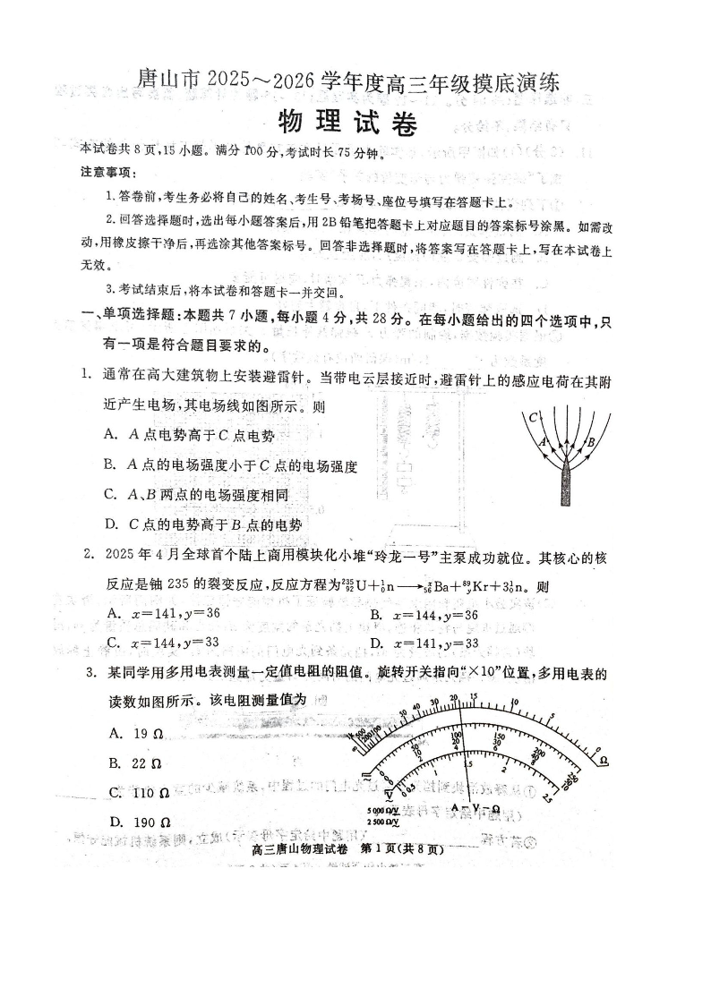 唐山市2025-2026学年度高三年级摸底演练 物理.pdf