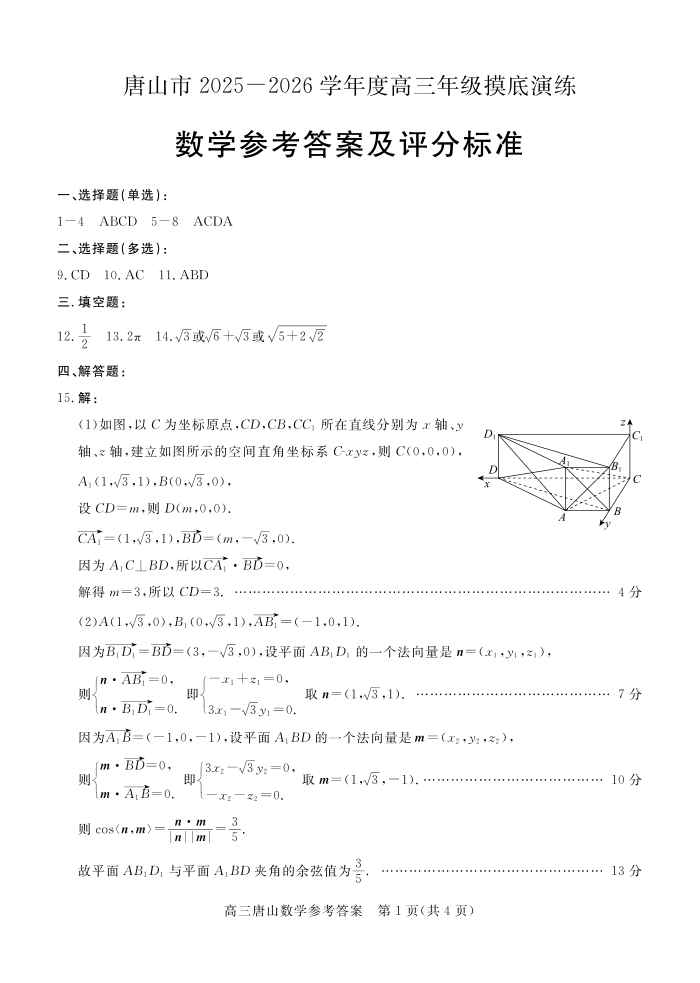 唐山市2025-2026学年度高三年级摸底演练 数学答案.pdf