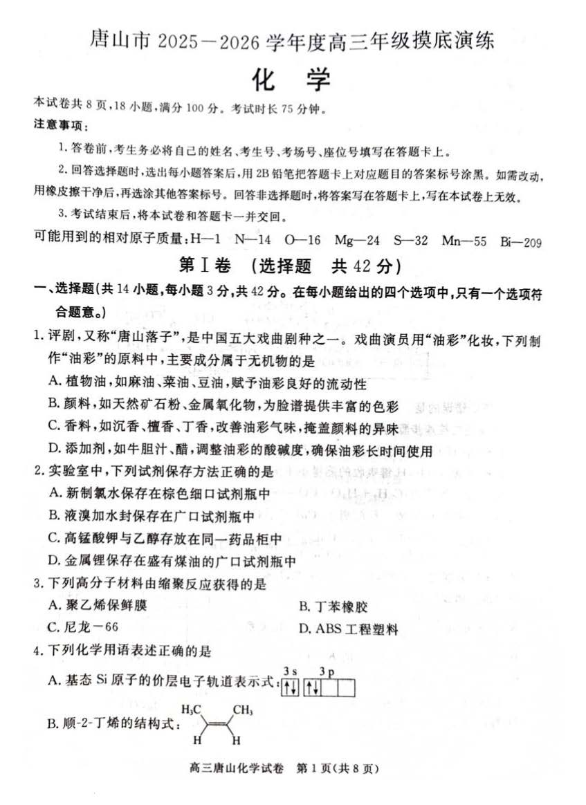 唐山市2025-2026学年度高三年级摸底演练 化学.pdf