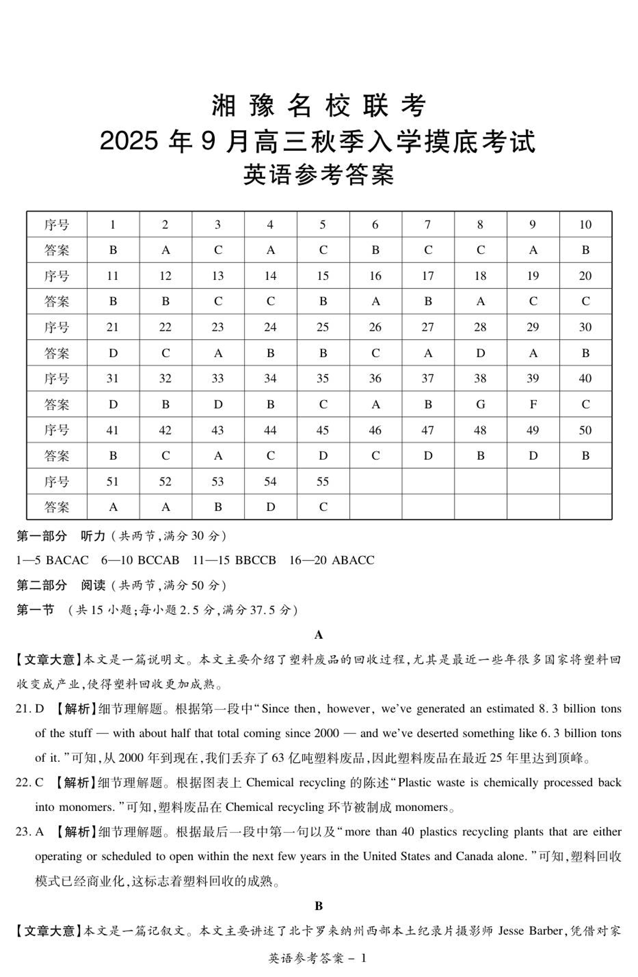 湘豫名校联考2025年9月高三秋季入学摸底考试 英语答案.pdf