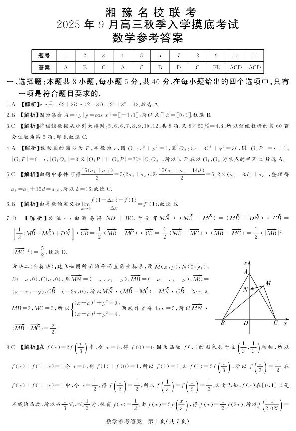 湘豫名校联考2025年9月高三秋季入学摸底考试 数学答案.pdf