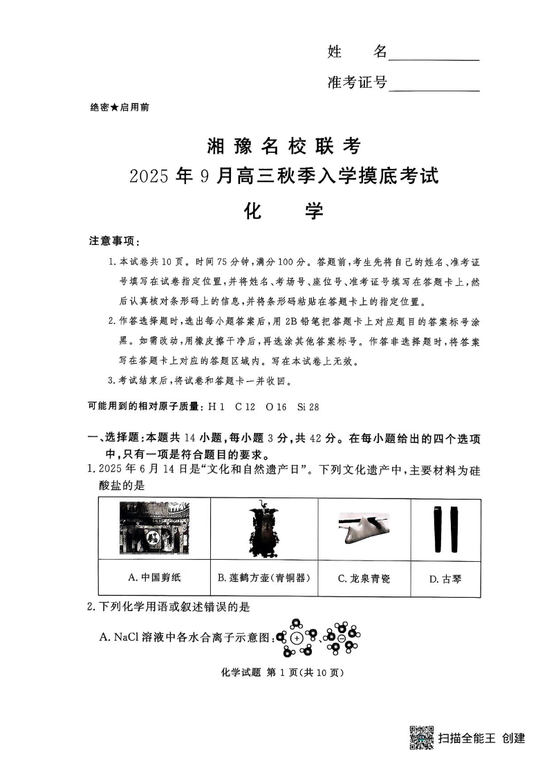 湘豫名校联考2025年9月高三秋季入学摸底考试 化学试卷(含答案).pdf