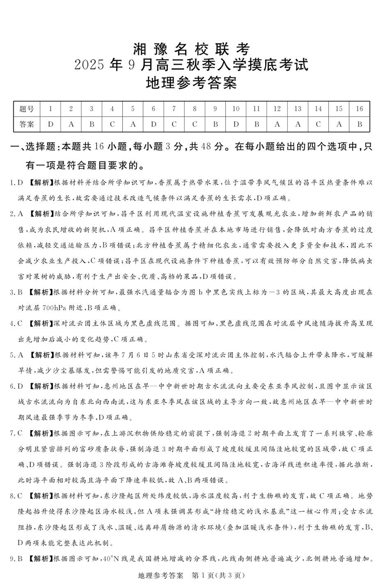 湘豫名校联考2025年9月高三秋季入学摸底考试 地理答案.pdf