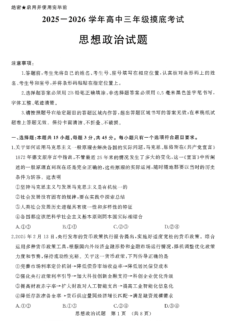 济南市2025-2026学年高三开学摸底考试 政治.pdf
