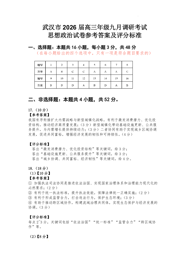 武汉市部分学校2025~2026学年度高三年级九月调研考试 政治答案.docx