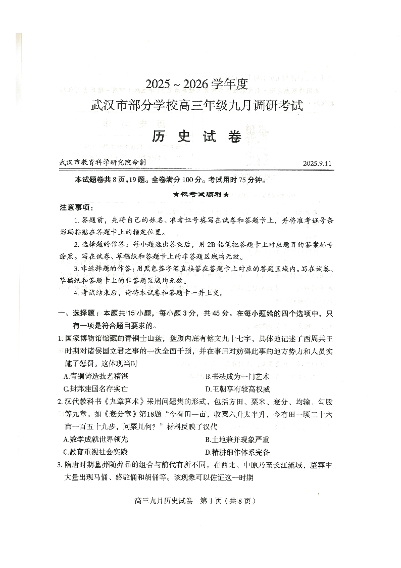 武汉市部分学校2025~2026学年度高三年级九月调研考试 历史.pdf