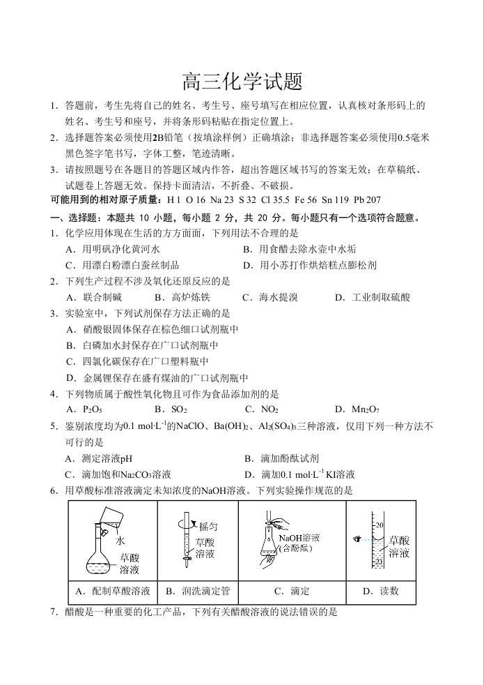 山东省泰安肥城市2025-2026学年高三上学期开学学情诊断 化学.docx