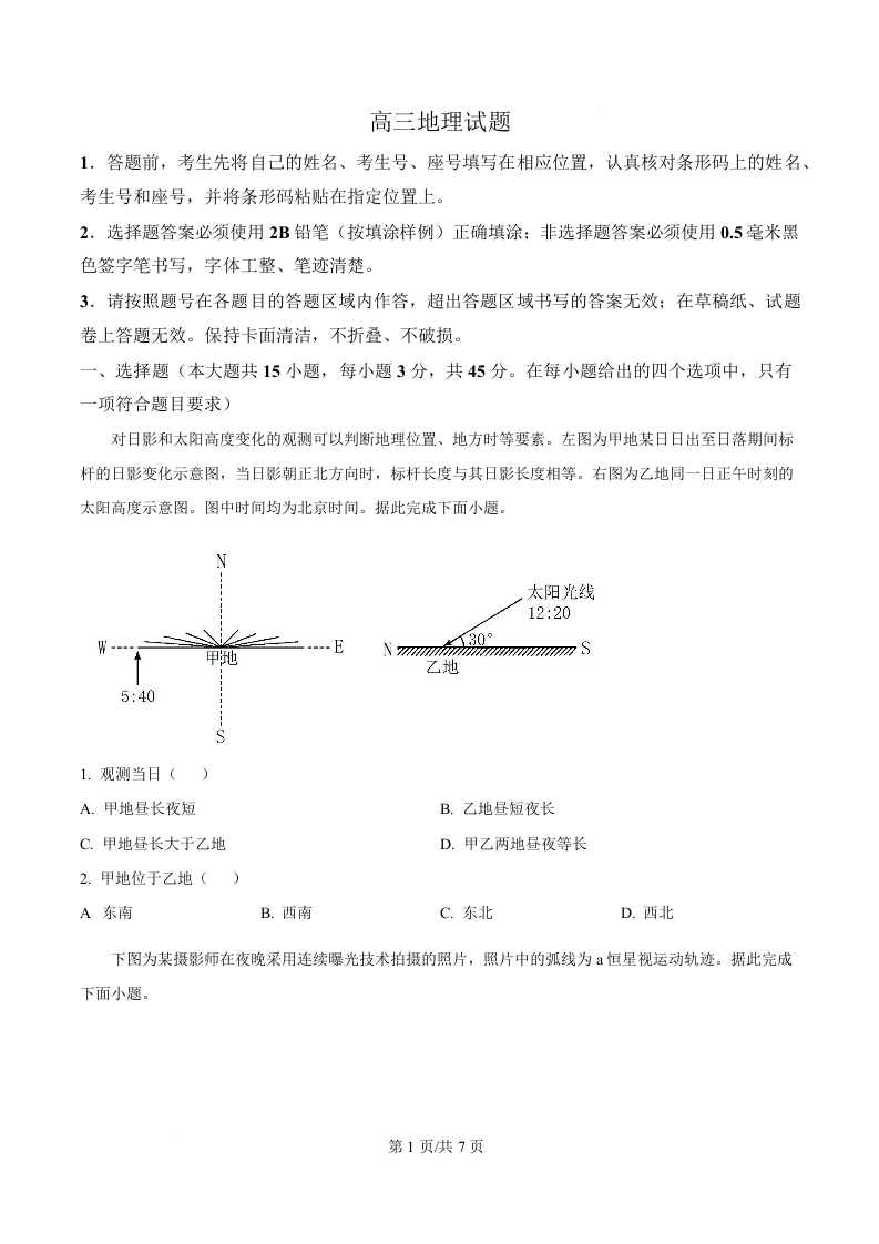 山东省泰安肥城市2025-2026学年高三上学期开学学情诊断 地理.docx