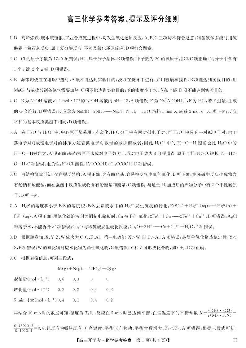 安徽省九师联盟2026届高三9月开学联考 化学答案.pdf