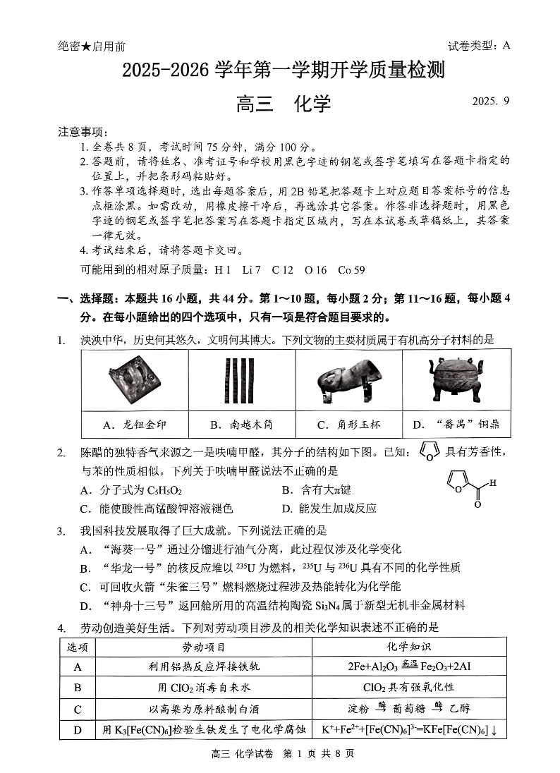 深圳市罗湖区2025-2026学年高三第一学期开学质量检测 化学.pdf