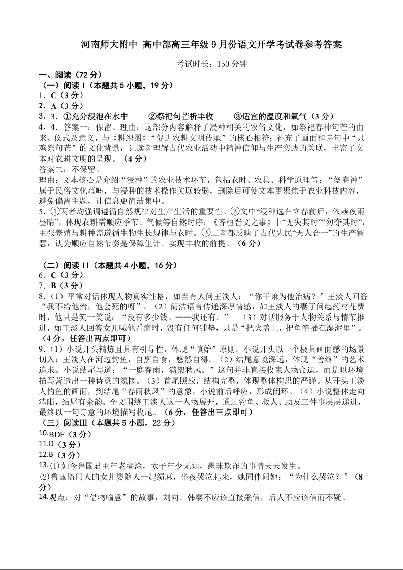 河南师范大学附属中学2025-2026学年高三上学期9月开学考试 语文答案.docx