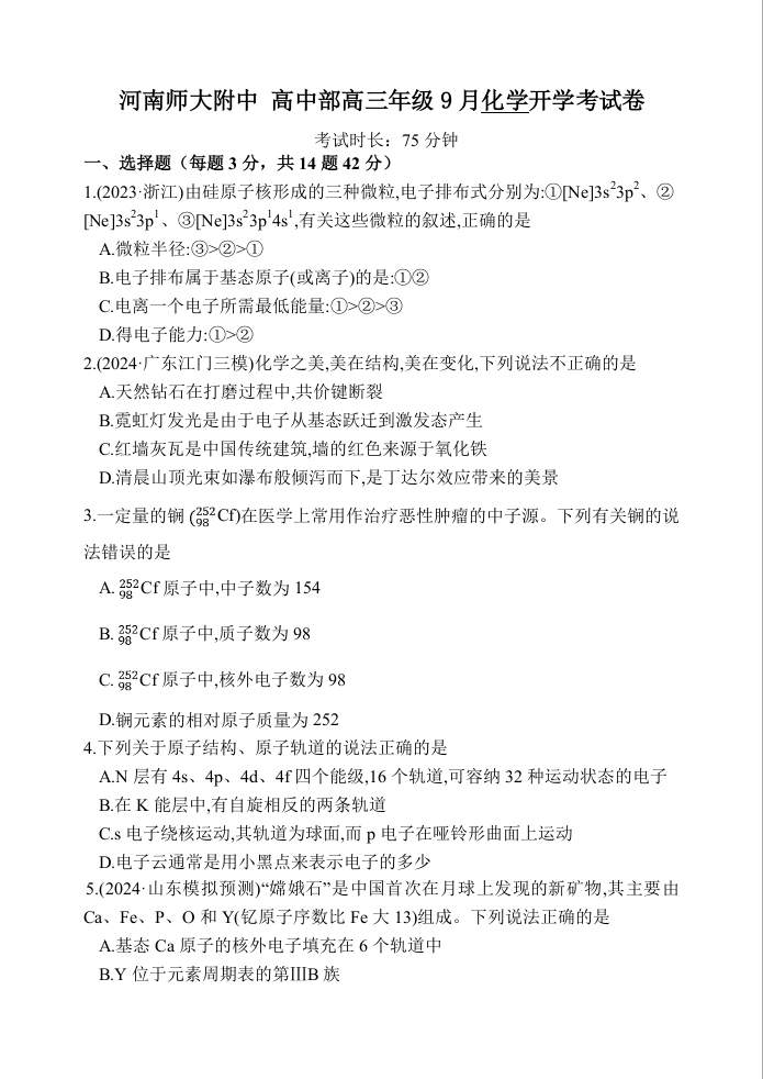 河南师范大学附属中学2025-2026学年高三上学期9月开学考试 化学.docx