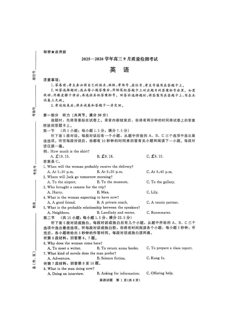 河南省青桐鸣2025-2026学年高三上学期9月质量检测考试 英语.pdf