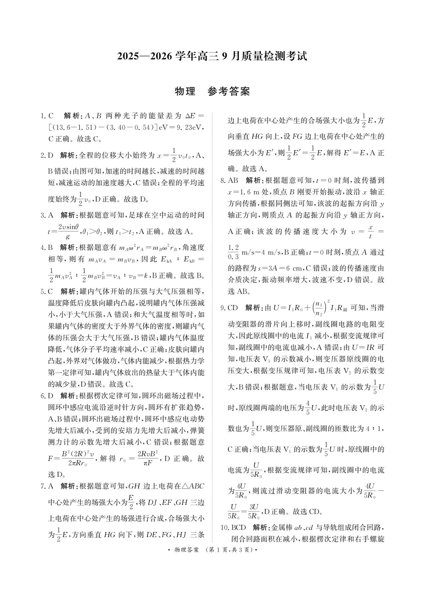 河南省青桐鸣2025-2026学年高三上学期9月质量检测考试 物理答案.pdf